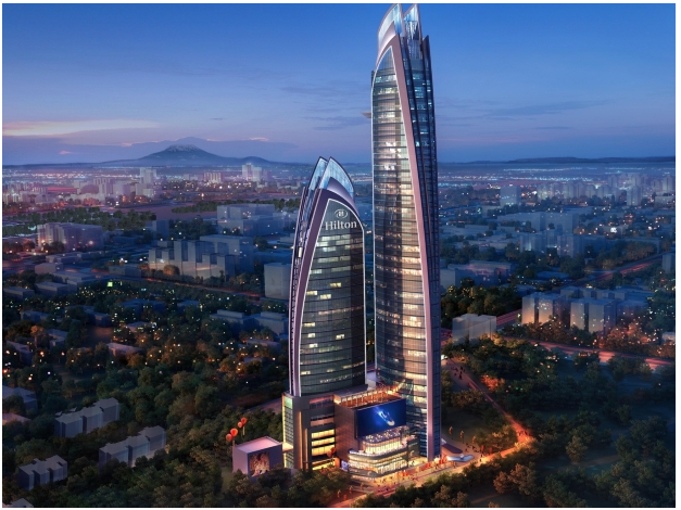 The taller building will host office spaces, a shopping mall and helipad and the other, a 255 room Hilton Hotel. The project will be constructed by China State Construction Engineering Corporation and the expected completion date is December 2019.