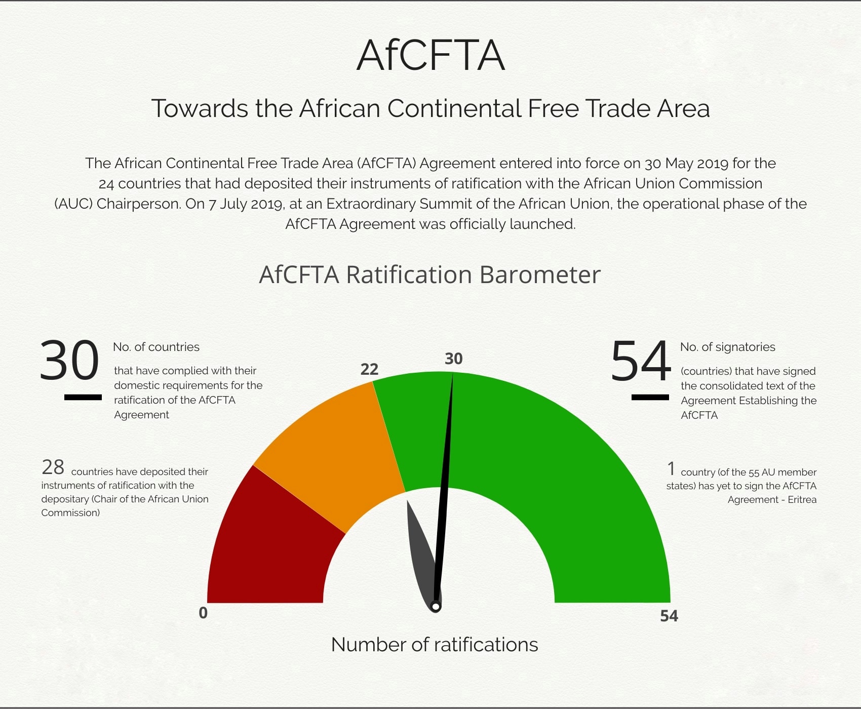 Presently, 30 out of 54 African nations have ratified the AfCFTA. The five operational instruments governing the AfCFTA are; the rules of origin; the online negotiating forum; the monitoring and elimination of non-tariff barriers; a digital payment system and the African Trade Observatory. Intra-Africa trade under the AfCFTA was set to commence in July 2020 but was delayed due to the COVID-19 pandemic.